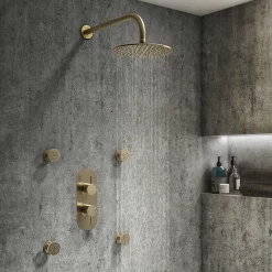 The Arezzo brushed brass modern concealed thermostatic control shower valve has been fitted with a handy two outlet valve and diverter, so you can switch water flow between a bath and shower, or between an overhead outlet and shower handset. You can also rest assured the clever thermostatic shower valve will always keep your water at a safe temperature. Features minimalist square handles this modern style shower valve is perfect for installing in a concealed arrangement.
