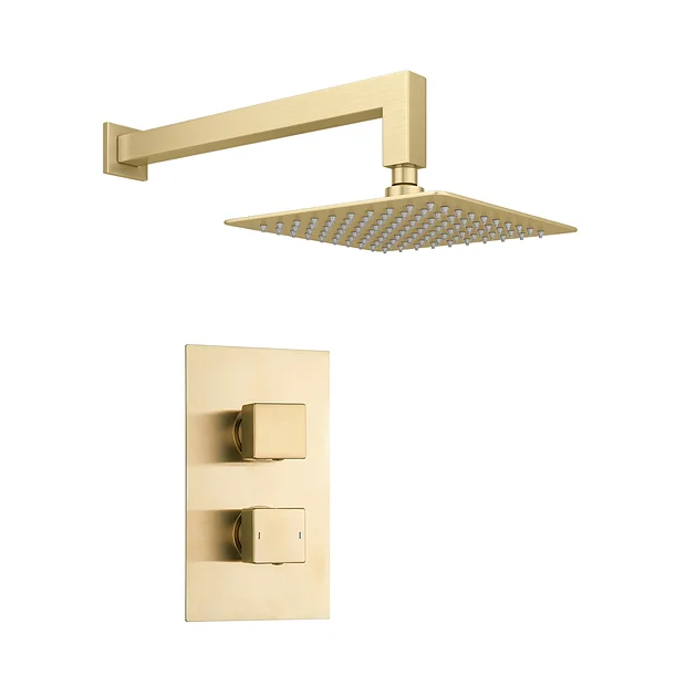 This Arezzo square concealed thermostatic valve features a luxury brushed brass finish with square tap head controls, perfect for creating an eye catching look in your bathroom. Offers thermostatic showering via two easy-to-operate controls for temperature and flow. The valve body comes with a contemporary rectangular backplate and has been constructed from solid brass. Supplied with matching wall mounted 200 x 200mm ultra-thin square fixed rainfall shower head with swivel joint and arm.