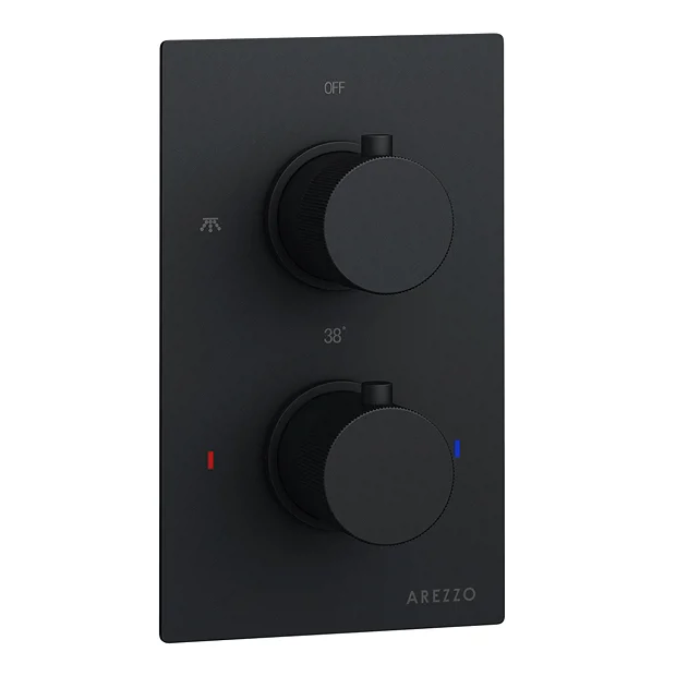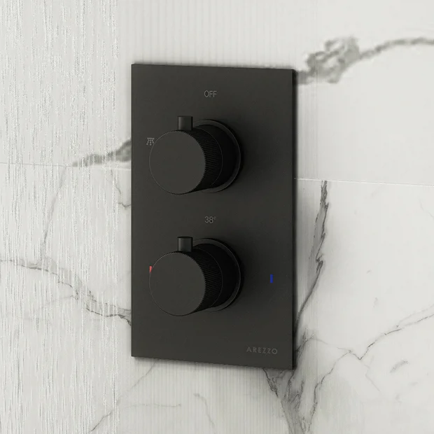 The Arezzo Concealed Thermostatic Shower Valve features a striking round design with a contemporary matt black finish and an decorative fluted texture around the sides of the flow and temperature controls. This ‘twin’ shower valve is perfect for installing in a concealed arrangement, linked to a fixed shower head.