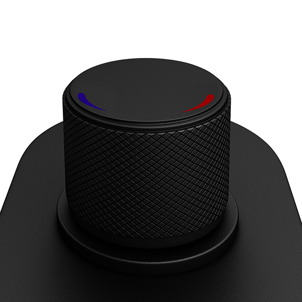 - Circular handle with a tactile knurled grip