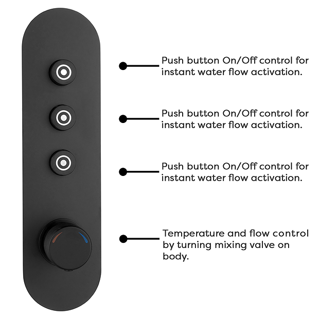 The stylish Arezzo industrial-style matt black 1 touch push button smart control shower valve is perfect for adding a striking finishing touch to your contemporary bathroom. Features easy to use instant 1 touch push button start/stop water flow activation. Temperature and flow is easily adjusted by simply turning the mixing valve. Crafted to the highest standards, this stunning shower valve features a round knurled textured tap head controls, perfect for creating an eye catching industrial look in your bathroom. Plated in a matt black finish which is highly resistant to corrosion. This ‘triple’ shower valve is perfect for installing in a concealed arrangement, outlets that can be operated individually, or enjoy one, two or three simultaneously.