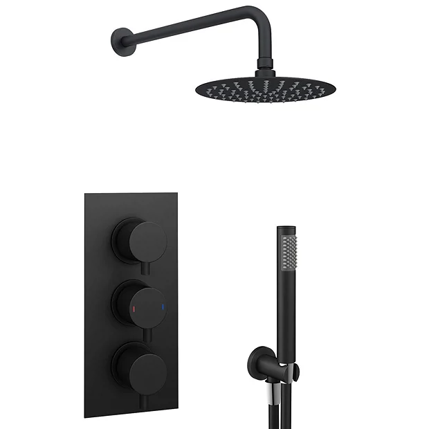 Arezzo Matt Black Round Triple Thermostatic Shower Pack with Head + Handset