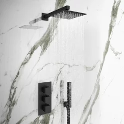 Concealed valve comes supplied with a matching wall mounted antique brass 8 inch rose shower head and shower handset with parking bracket, hose.