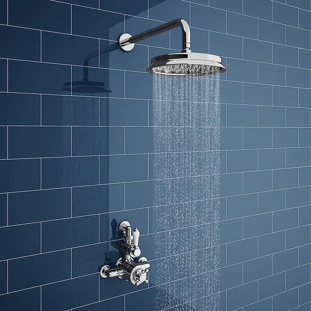 The Chatsworth 1928 traditional twin exposed thermostatic shower valve pack with stylish ceramic control dial offers thermostatic showering via two easy to operate controls, one operates flow control whilst the other allows temperature selection.
