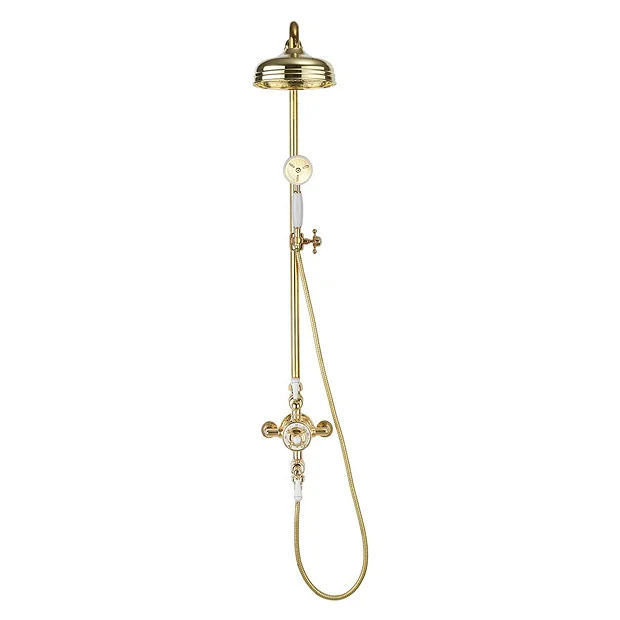 This thermostatic shower valve with 8″ fixed head, slider rail and handset is a traditional style from the Belgravia exposed valve collection. Its timeless and elegant design will make this a centrepiece for any traditional bathroom. Features an advanced thermostatic Vernet cartridge and smooth diverter which brings together function and superior style. The shower comes in an unlacquered brass finish, designed to oxidise over time resulting in a change of colour and a unique look which gives even more personality to your bathroom.