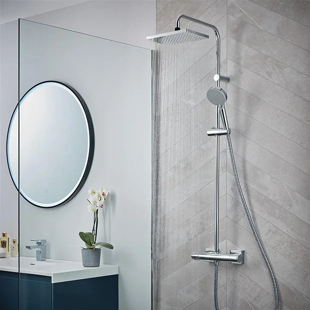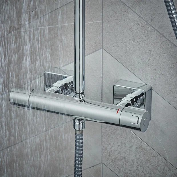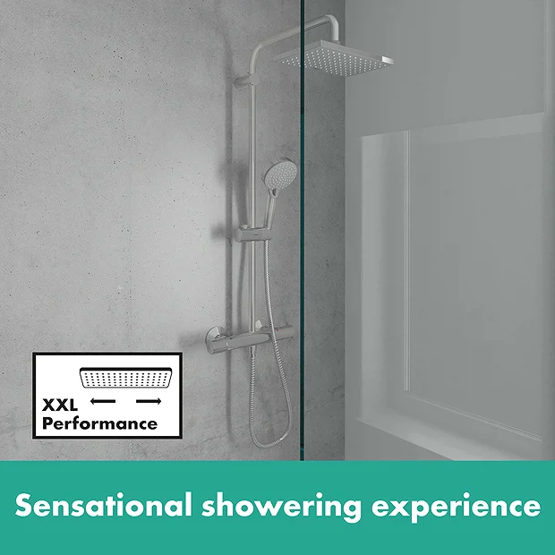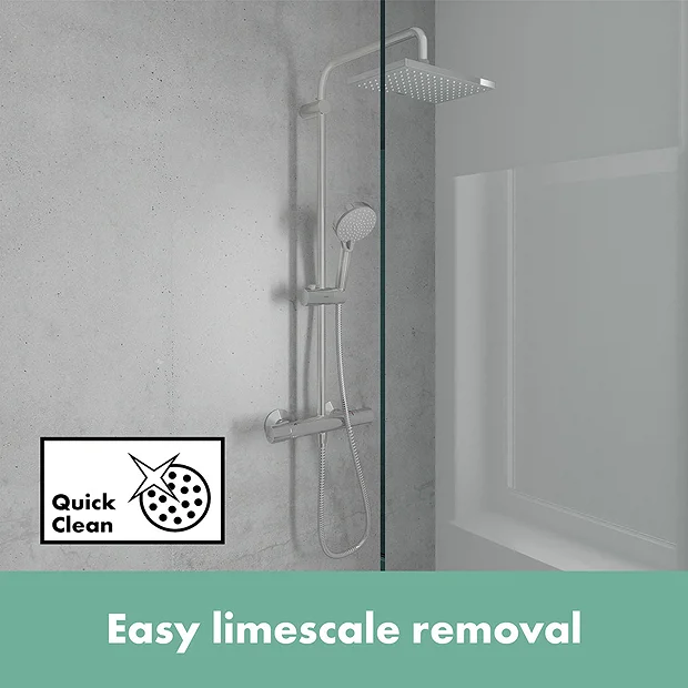 The Vernis Shape Showerpipe 230 Thermostatic Shower Mixer combines a hand and overhead shower, as well as a thermostat, into one product. It features a large 230mm shower head and shower handset with a height-adjustable shower holder that can also be turned and tilted. The self-locking slider can be operated with one hand. It’s Rain spray is perfect for rinsing shampoo out of your hair while the QuickClean rub clean nubs loosens any limescale deposits making sure your hand shower looks beautiful, and stays working for longer.