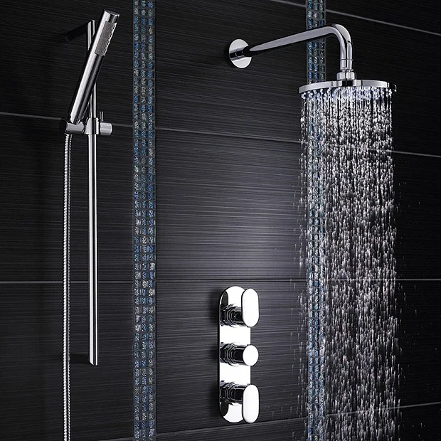 The Reign Triple Concealed Thermostatic Shower Valve with Divertor from Hudson Reed. Suitable for all types of plumbing installation this shower valve has the added safety benefit of a built in anti scald device should the cold water supply fail.