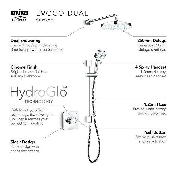 - Mira Evoco’s 250mm deluge showerhead is carefully engineered to maximise flow and coverage. For a more luxurious showering experience
