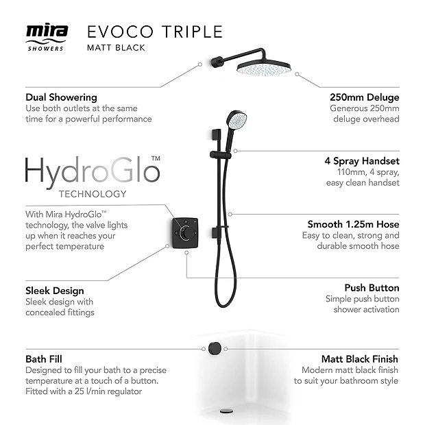 Mira Evoco Triple Outlet Matt Black Thermostatic Mixer Shower with Bathfill – 1.1967.010