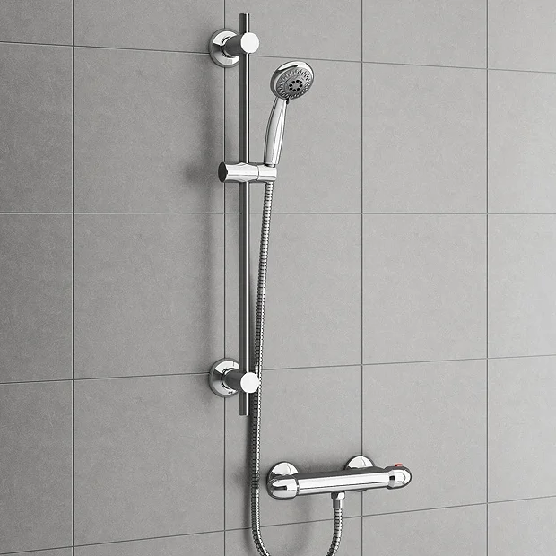 This Exposed Thermostatic Bar Shower Valve is part of our contemporary collection of bathroom products. Modern styling with chrome finish and constructed from solid brass. Thermostatic showers prevent a fluctuation in temperature whilst the shower is running – prevents the risk of scalding, or sudden cold spells. The valve is pre-set to a safe and optimal 38°C, this can be easily offset by holding down the safety push and click button on the handle.